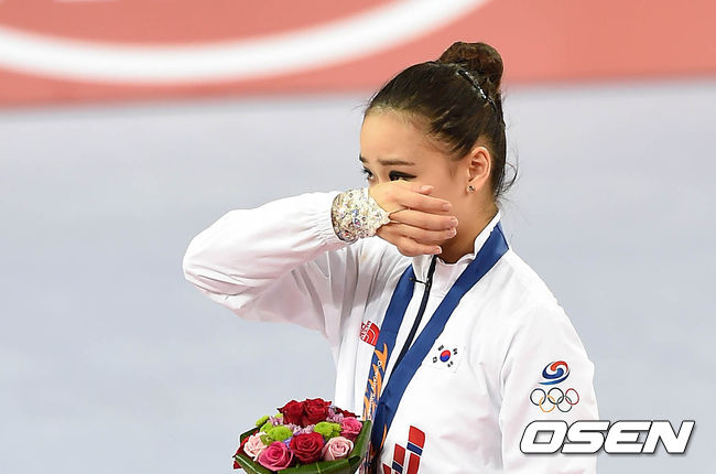 금메달을 획득한 한국 손연재가 눈물을 훔치고 있다. /sunday@osen.co.kr