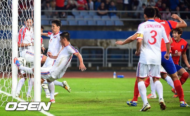 연장 후반 종료 직전 임창우의 결승골이 터지기에 앞서 이용재의 슛을 북한 리영직이 손으로 친 게 골라인을 넘어서려는 순간 서현욱이 걷어내고 있다./ soul1014@osen.co.kr