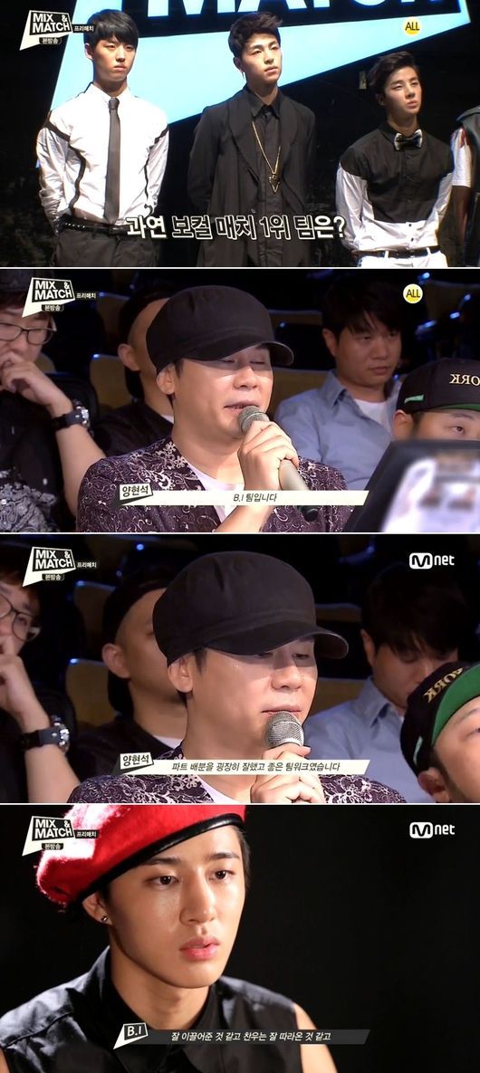 B.I팀은 2일 오후 방송된 엠넷 예능프로그램 ‘믹스앤매치’에서 진행된 보컬매치에서 그린데이의 ‘바스킷 케이스’로 신나는 무대를 꾸몄다.