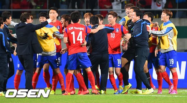 경기종료 휘슬이 불리자 대표팀 선수들이 기뻐하고 있다. / soul1014@osen.co.kr