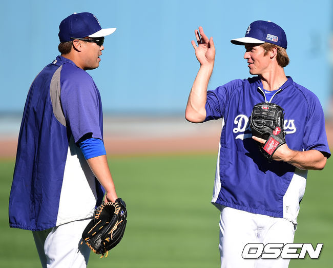다저스 류현진이 그레인키와 캐치볼을 마치고 미소를 지으며 이야기를 나누고 있다.