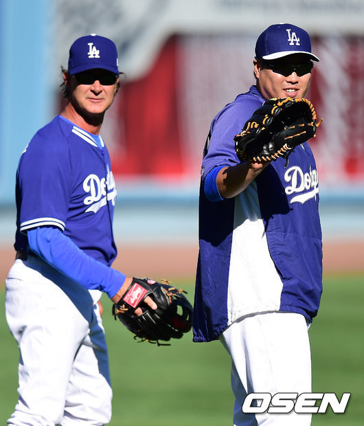 다저스 매팅리 감독이 그레인키와 캐치볼을 하는 류현진을 지켜보고 있다.