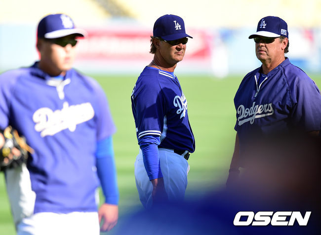 다저스 매팅리 감독, 허니컷 코치가 류현진을 지켜보고 있다.