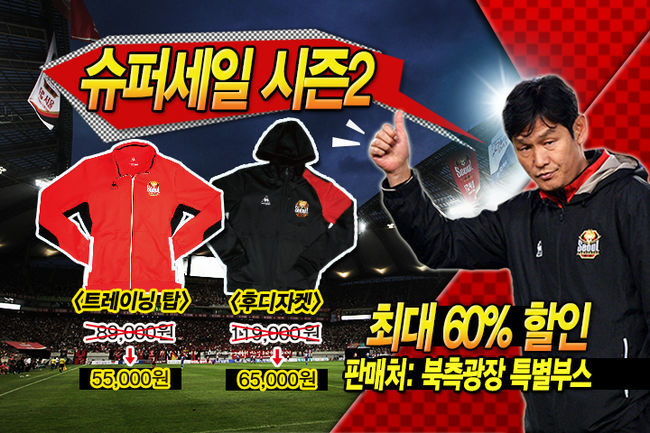 지난 7월 열린 슈퍼매치에서 ‘SUPER SALE’ 행사를 진행한 FC서울은 팬들의 뜨거운 호응에 힘입어 2번째 ‘SUPER SALE’을 진행한다. 이번 행사에는 그 동안 많은 인기를 끌어온 13년도 선수단 의류와 각종 추계 의류가 최대 60% 할인된 가격에 판매된다.