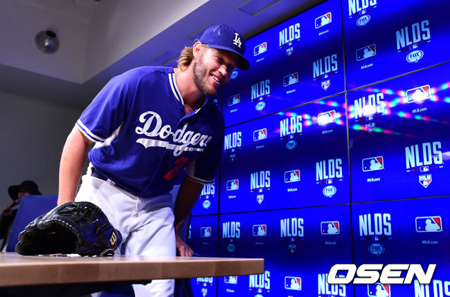 다저스 커쇼가 기자회견을 마치고 인터뷰룸을 나서고 있다.