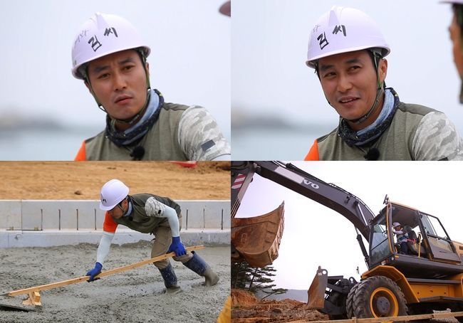또 다른 사진 속 김병만은 건실한 일꾼 ‘김씨’로서의 활약에 여념이 없는 모습이다. 시멘트 반죽을 평평하게 만들기 위해 시선을 바닥에 고정한 채 작업에 열중하고 있고, 이에 더해 한 눈에 보기에도 엄청난 크기의 중장비를 능숙하게 다루고 있어 ‘달인’ 김병만의 노력과 열의를 느낄 수 있게 한다.