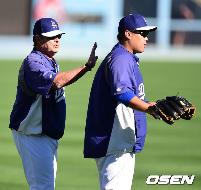 다저스 허니컷 코치가 캐치볼을 하던 류현진과 이야기를 나누고 있다.
