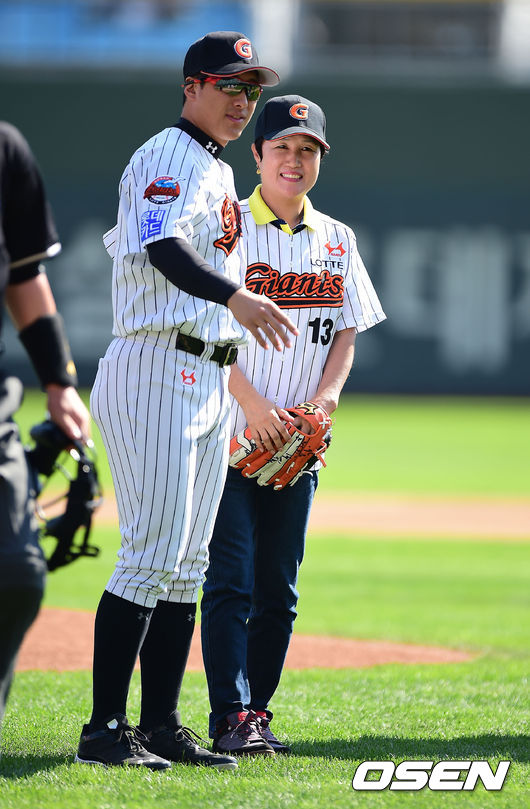 3일 오후 부산 사직야구장에서 '2014 한국야쿠르트 세븐 프로야구' 롯데 자이언츠와 한화 이글스의 경기가 열렸다. 황재균이 시구를 마친 어머니와 이야기를 나누고 있다. 설민경 씨는 테니스 국가대표 출신으로 1982년 뉴델리 아시안게임 금메달리스트이다. 이번 대회에서 황재균이 금메달을 획득하며 '한국 최초 모자(母子) 금메달리스트' 타이틀도 함께 얻게 되었다. 한편, 이날 경기에는 양 팀 좌완 투수들이 선발로 출격한다. 롯데에서는 외국인 좌완 쉐인 유먼, 한화에서는 토종 좌완 유창식이 각각 선발등판한다. / youngrae@ose.co.kr