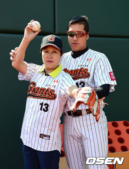 3일 오후 부산 사직야구장에서 '2014 한국야쿠르트 세븐 프로야구' 롯데 자이언츠와 한화 이글스의 경기가 열렸다. 경기에 앞서 롯데 황재균이 어머니 설민경 씨와 시구연습을 하고 있다. 설민경 씨는 테니스 국가대표 출신으로 1982년 뉴델리 아시안게임 금메달리스트이다. 이번 대회에서 황재균이 금메달을 획득하며 '한국 최초 모자(母子) 금메달리스트' 타이틀도 함께 얻게 되었다. 한편, 이날 경기에는 양 팀 좌완 투수들이 선발로 출격한다. 롯데에서는 외국인 좌완 쉐인 유먼, 한화에서는 토종 좌완 유창식이 각각 선발등판한다. / youngrae@ose.co.kr