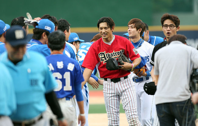 지난 8월25일 서울 목동구장에서 한국프로야구은퇴선수협회(회장 이순철)와 연예인 올스타간의 야구 경기를 마치고 서로 인사하는 모습. 빨간 유니폼은 배우 오지호이다.