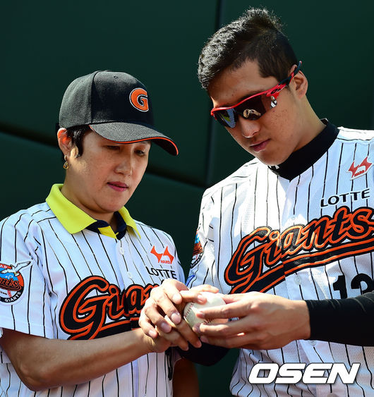 3일 오후 부산 사직야구장에서 '2014 한국야쿠르트 세븐 프로야구' 롯데 자이언츠와 한화 이글스의 경기가 열렸다. 경기에 앞서 롯데 황재균이 어머니 설민경 씨와 시구연습을 하고 있다. 설민경 씨는 테니스 국가대표 출신으로 1982년 뉴델리 아시안게임 금메달리스트이다. 이번 대회에서 황재균이 금메달을 획득하며 '한국 최초 모자(母子) 금메달리스트' 타이틀도 함께 얻게 되었다. 한편, 이날 경기에는 양 팀 좌완 투수들이 선발로 출격한다. 롯데에서는 외국인 좌완 쉐인 유먼, 한화에서는 토종 좌완 유창식이 각각 선발등판한다. / youngrae@ose.co.kr