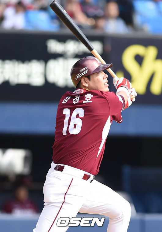 1회 1사 만루 강정호 우측담장을 맞추는 2타점 적시타를 날리며 타구를 바라보고 있다.