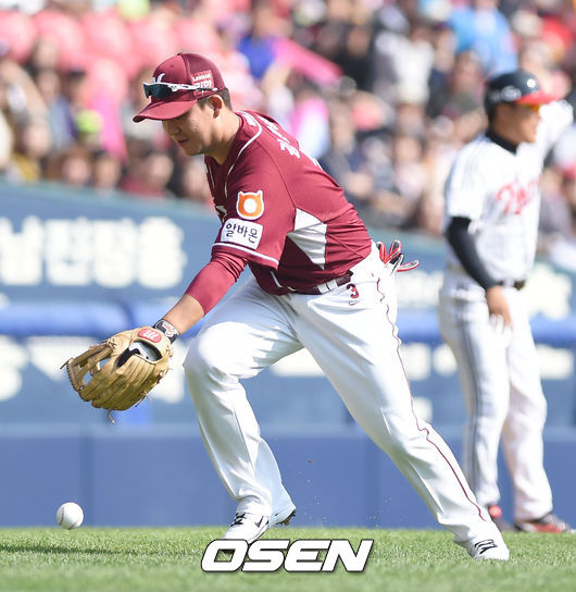 2회말 무사 1,2루 이병규의 보내기번트때 넥센 김민성 3루수가 실책을 하면서 주자 만루 위기상황을 만들고 있다.