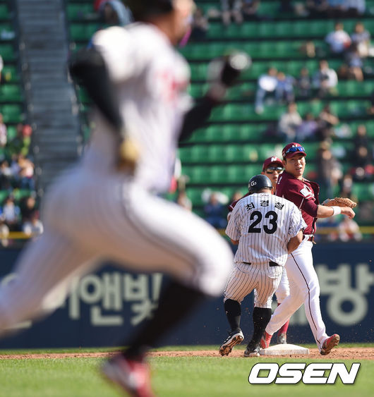 3일 오후 잠실야구장에서 열린 '2014 한국야쿠르트 세븐 프로야구' LG 트읜스와 넥센 히어로즈의 경기,4회말 무사 1루 오지환 유격수앞 땅볼때 넥센 강정호 유격수 1루주자 최경철 2루에서 포스아웃 시키며 1루에 송구 병살아웃 처리시키고 있다.