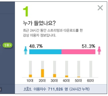 최근 24시간 이용자는 70만명이 넘어섰다. 지난 2일에는 90만명에 육박하는 기염을 토하기도 했다. 또 2일 하루동안 '지붕킥'을 네번 한 것으로 집계됐다. '지붕킥'은 이용지수가 차트 집계를 넘어서는 경우를 뜻한다.