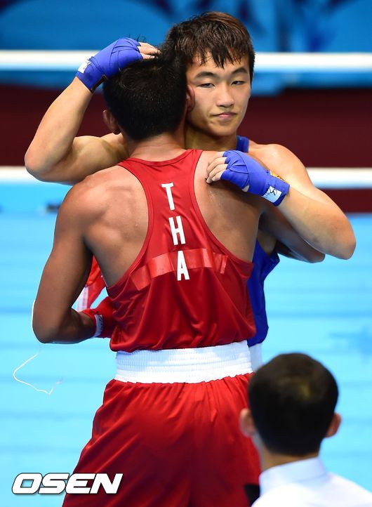 3일 인천 선학복싱장에서 열린 2014 인천 아시안게임 남자 복싱 64kg급 결승전, 은메달을 획득한 임현철이 태국 선수에게 축하의 인사를 건네고 있다.