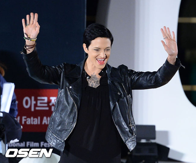 이탈리아 배우 아시아 아르젠토가 3일 오후 부산광역시 해운대 비프빌리지 야외무대에서 열린 오픈토크에 참석해 팬과 인사하고 있다.