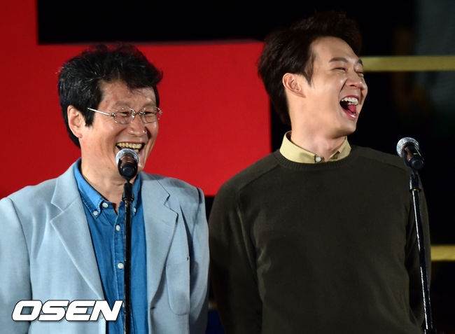 3일 오후 부산광역시 해운대구 중동 해운대 비프빌리지에서 열린 영화 '해무' 야외무대인사에서 문성근과 박유천이 미소짓고 있다.
