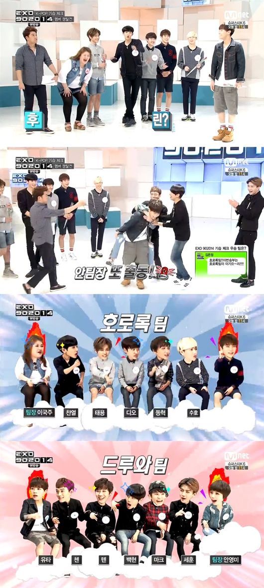 3일 오후 방송된 케이블채널 엠넷 ‘엑소 902014’에는 그간 배운 K팝에 대해 확인을 하는 퀴즈 대결이 진행됐다. 이국주 팀에는 디오, 수호 찬열이, 안영미 팀에는 첸, 백현, 세훈이 선정됐다.