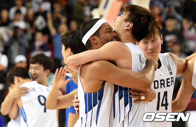금메달을 차지한 한국 문태종과 김종규가 환호하고 있다. /sunday@osen.co.kr