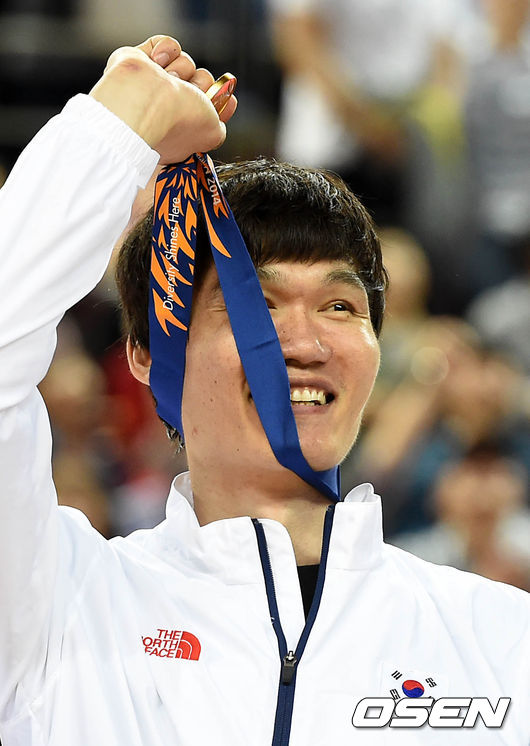 금메달을 차지한 한국 김주성이 시상대에서 미소를 짓고 있다. /sunday@osen.co.kr