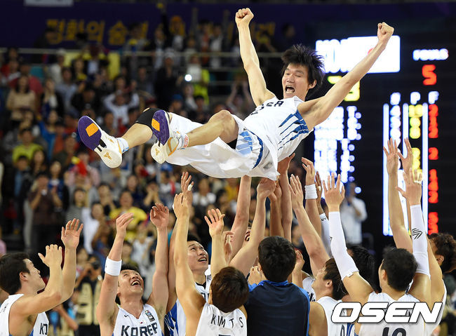 경기 종료 후 금메달을 차지한 한국 김주성이 동료들에게 헹가래를 받고 있다. /sunday@osen.co.kr