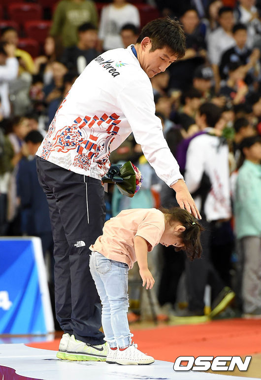 경기 종료 후 금메달을 차지한 한국 양동근이 자녀와 함께 시상대에서 인사를 하고 있다. /sunday@osen.co.kr