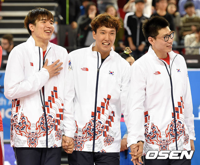 금메달을 차지한 한국 김종규, 이종현, 오세근이 시상대에서 미소를 짓고 있다. /sunday@osen.co.kr