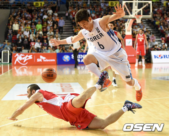 4쿼터 한국 양동근이 이란 선수와 충돌하고 있다. /sunday@osen.co.kr