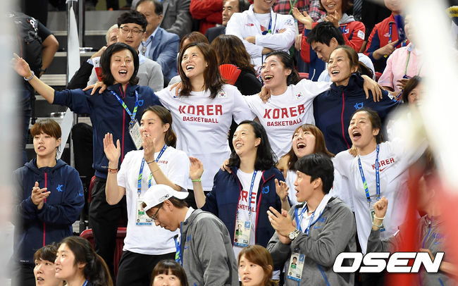 경기장을 찾은 한국 여자 농구 대표팀이 응원하고 있다. /sunday@osen.co.kr