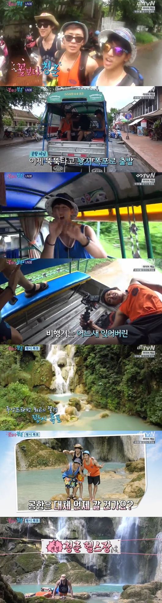 세 사람은 비행기 탑승 6시간 전, 꽝시 폭포를 방문했다. 가는 동안 머리에 꽃을 꽂고 "꽃보다 청춘"을 외치는가 하면, 이동하는 트럭칸에서는 격렬한 립싱크로 기쁨을 표하기도 했다.