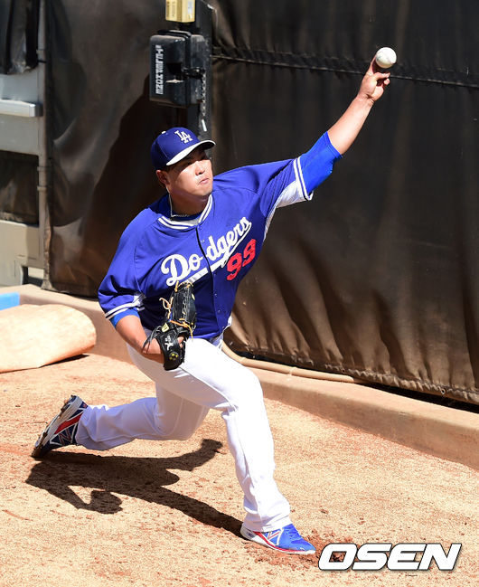 경기에 앞서 다저스 류현진이 불펜 피칭을 하고 있다.