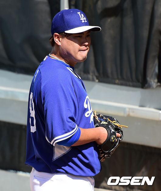 경기에 앞서 다저스 류현진이 불펜 피칭을 하고 있다.