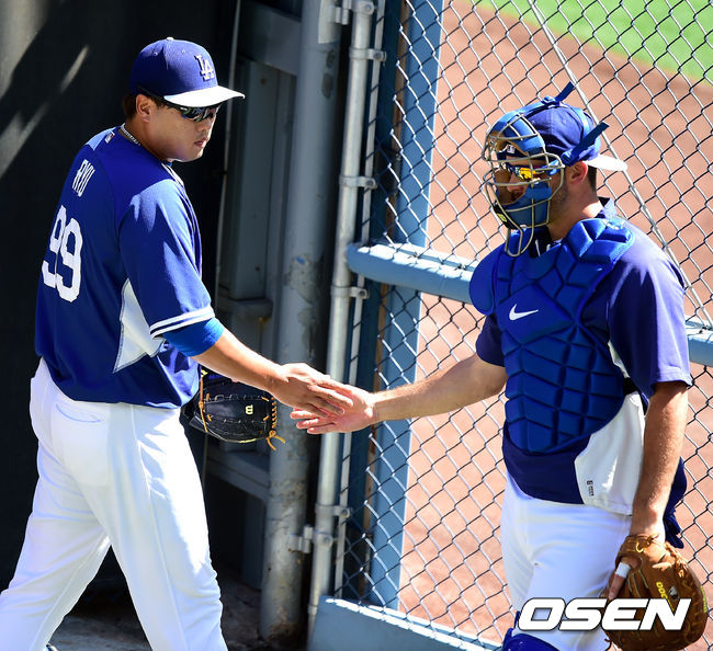 경기에 앞서 다저스 류현진이 불펜 피칭을 마치고 부테라와 인사를 나누고 있다.