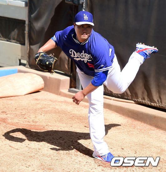 경기에 앞서 다저스 류현진이 불펜 피칭을 하고 있다.