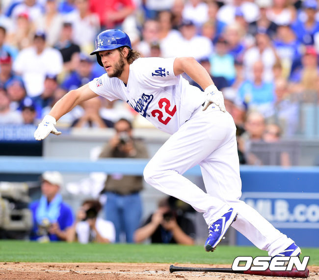 2회말 1사 1,2루 커쇼가 보내기 번트를 성공시키고 있다.