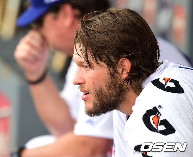 LA 다저스 선발투수 커쇼가 선제 솔로홈런을 허용하고 더그아웃에서 아쉬워하고 있다.