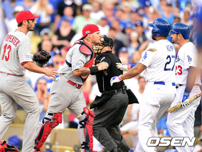 3회말 무사 푸이그의 사구에 화가 난 곤잘레스가 몰리나 포스와 설전을 벌이자 양팀 선수들이 뛰어나와 벤치클리어링을 벌이고 있다.