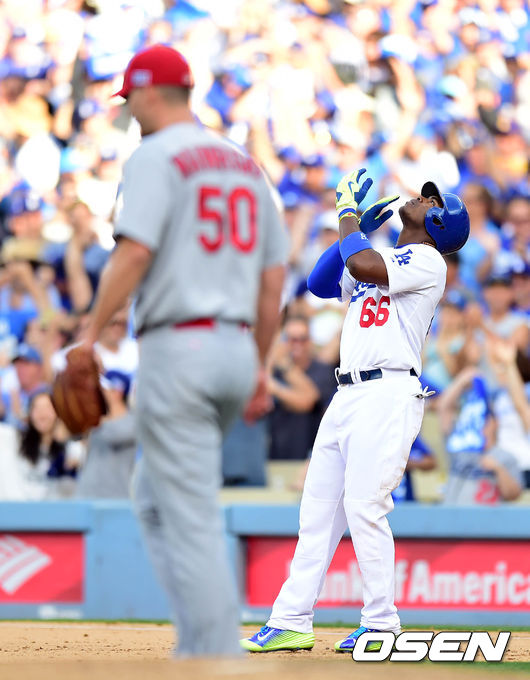 4회말 2사 3루 푸이그가 적시타를 치고 세리머니를 펼치고 있다.
