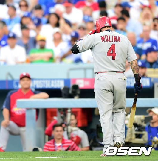5회초 몰리나가 커쇼에게 삼진을 당하고 물러나고 있다.