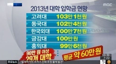 이 조사에 따르면 대학 입학금은 법적 근거와 기준이 없으며, 등록금이 비싼 사립대의 경우 입학금이 가장 많은 대학은 고려대로 103만원이었다. 반면 국공립대 중에서는 인천대 입학금이 40만원으로 조사됐다. 또 영산선학대의 경우 15만원에 불과했고, 광주가톨릭대학은 아예 입학금이 없었다.