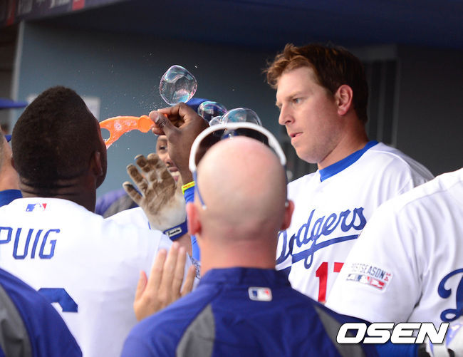 5회말 1사 1루 A.J 엘리스가 투런 홈런을 치고 들어오자 푸이그가 직접 비눗방울을 불어주고 있다.