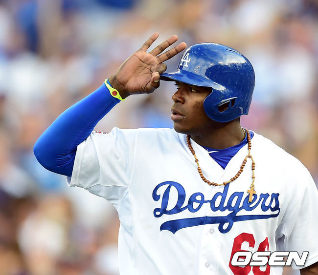 3회말 2사 2루 푸이그가 라미레즈의 동점타때 득점후 라미레즈의 세리머니를 따라하고 있다.