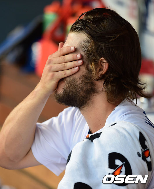 6회초 카펜터에게 홈런을 맞은 커쇼가 더그아웃에서 아쉬워 하고 있다.