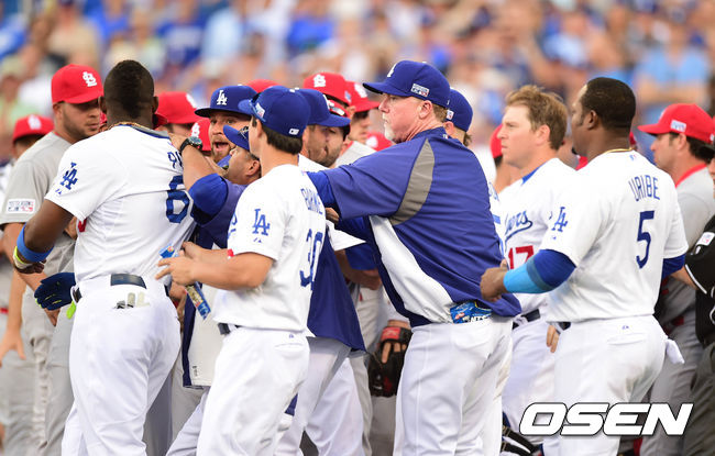 3회말 푸이그의 사구때 곤잘레스와 몰리나의 설전으로 벤치클리어링이 벌어지고 있다.