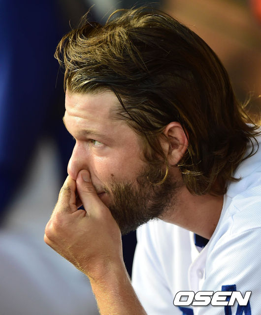 7회초 2사 만루서 카펜터에 역전 싹쓸이 2루타를 맞은 커쇼가 아쉬워 하고 있다.