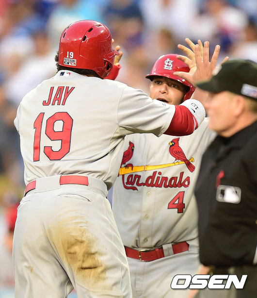 7회초 2사 만루서 카펜터에 역전 싹쓸이 2루타때 홈을 밟은 몰리나와 제이가 환호하고 있다.