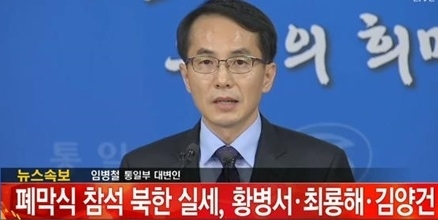 임병철 통일부 대변인은 4일 오전 긴급브리핑을 열어 황병서 북한 조선인민군 총정치국장, 최룡해 노동당 비서, 김양건 비서 등 북한측 인사가 이날 저녁 열리는 인천아시안게임 폐회식에 참석하기 위해 인천을 방문할 것이라고 밝혔다.