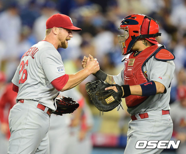 난타전 끝에 승리한 세인트루이스 몰리나 포수와 트레버 로젠탈 투수가 환호하고 있다./jpnews@osen.co.kr