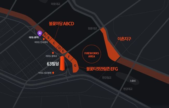 한편 불꽃축제를 즐기기 위한 명당으로는 63빌딩과 남산타워, 한강대교 전망대 쉼터 등이 꼽힌다. 가족끼리 돗자리를 깔고 불꽃축제를 감상할 수 있는 한강시민공원과 한강철교 북단 등도 매년 불꽃축제 행사 때마다 수많은 시민들이 찾고 있다.